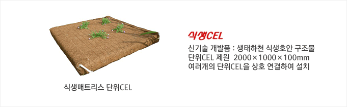 식생CEL 신기술은 공장에서 식생CEL 내부에 식물생육에 유리한 양질의 식생토를 채우고 완전 밀봉하여 제작되고 갈대, 창포 등 수생식물을 포트 형태로 식재하여 식재완성형 단위CEL로 출고되며 현장에서 연결 설치함.