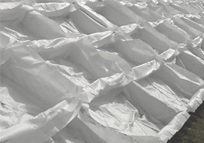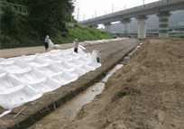 2) 솔라백의 주요 재질로써 몸체부는 토목섬유부직포로 구성되고, 덮개부(씨앗부착식생부)는 코이어블랑켓, PET고강도그물망,황마씨줄네트로 구성되며, 특히 PET 고강도 그물망은 인장강도 2ton/m 이상으로 유수에 의해 떠내려오는 나뭇가지 등 외부 충격에 의한 파열을 방지함.